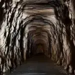 Prior to dynamite, black powder was used to blast rock such as the blue granite of Stump House Mountain. “Heading” Teams would drill “shot holes,” horizontally along what would be the top of the tunnel opening. These were followed by “Benching” teams who would drill vertical holes for blasting to extend the opening downward, thus creating a stair step effect. This effect is still visible at the end of Stump House Tunnel today.